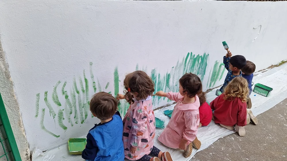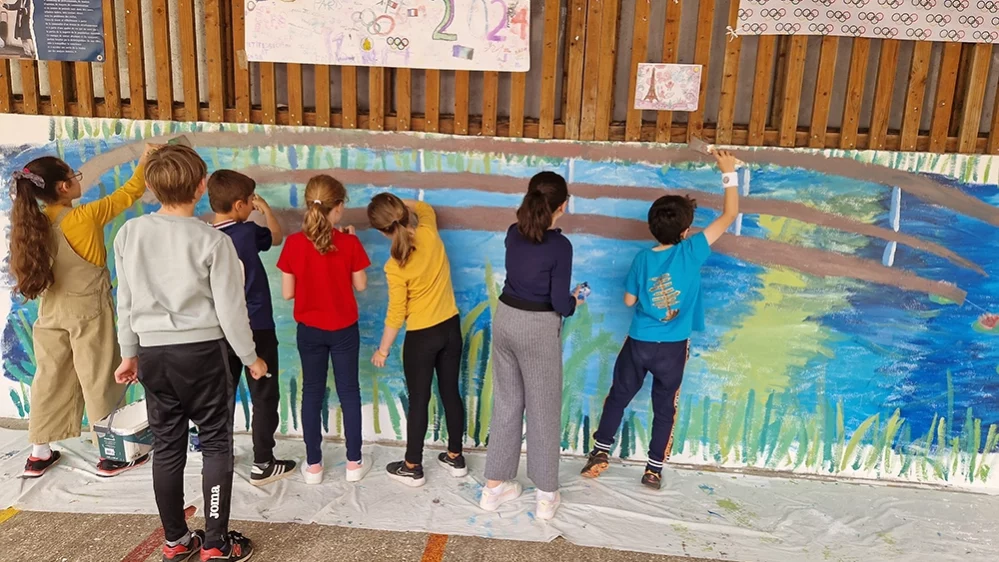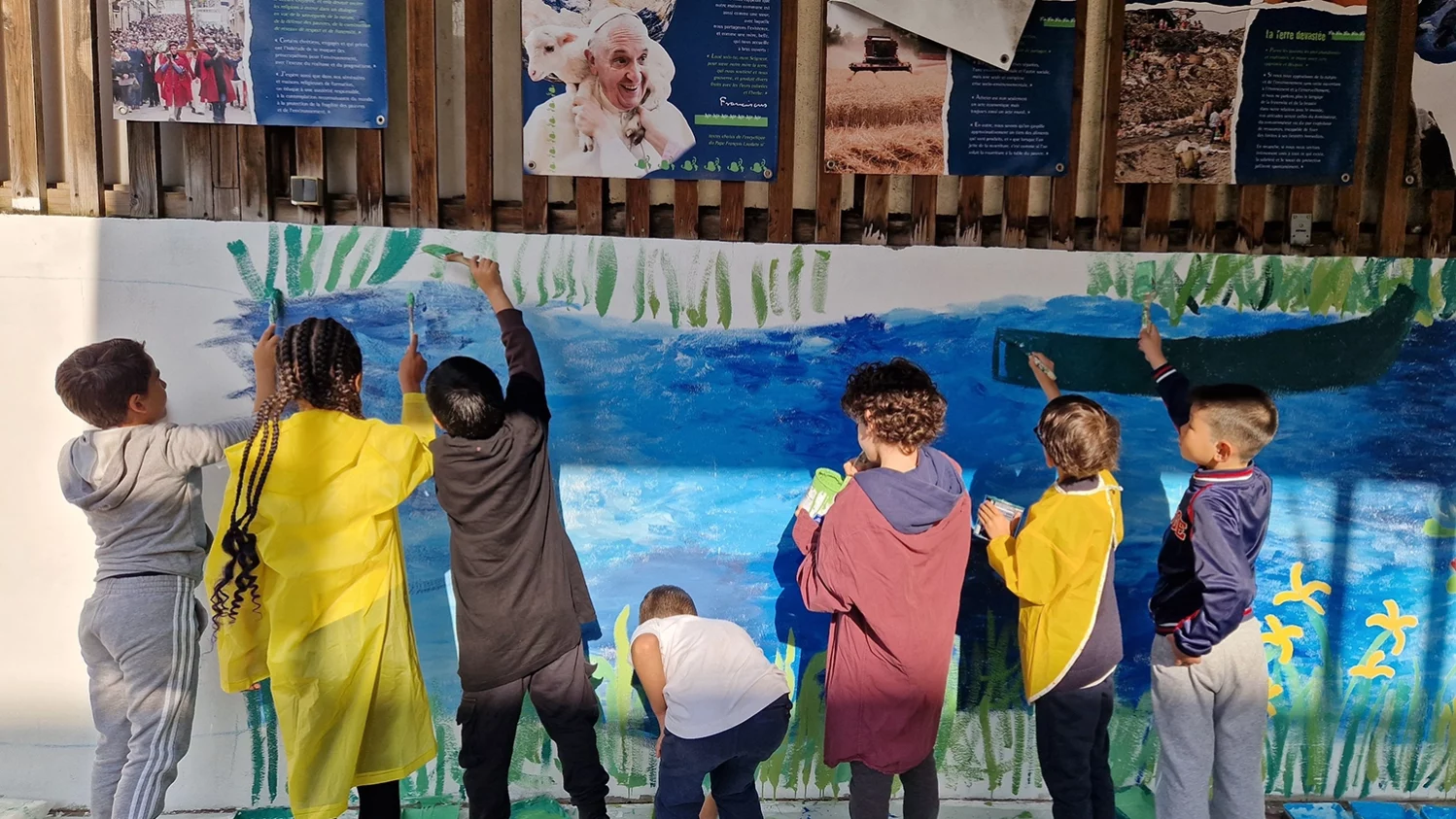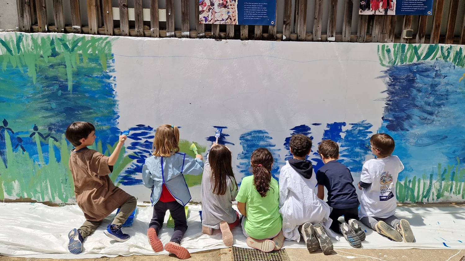Stéphanie Vial a pris les classes de maternelles au CM2 par petits groupes pour réaliser ce travail collectif. Chacun a été acteur de la fresque pour un projet final : embellir le mur de son école !