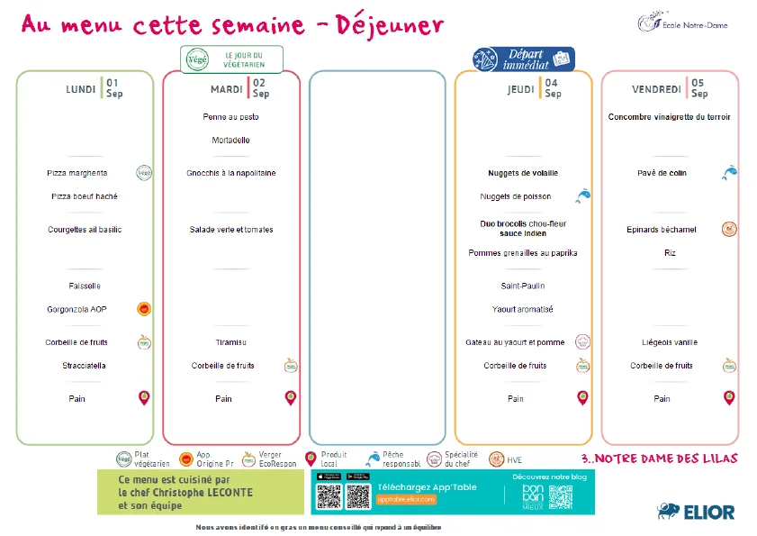 Les repas sont élaborés en cuisine centrale, livrés et accommodés sur site. Ils se composent entre deux choix